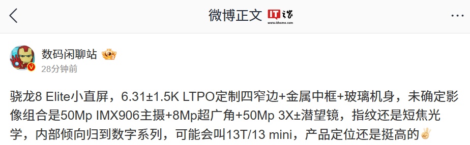 文章来源于互联网:IT之家-消息称某厂小直屏方案骁龙 8 Elite 手机“可能”会叫 13T / 13 mini,预计为一加新机
