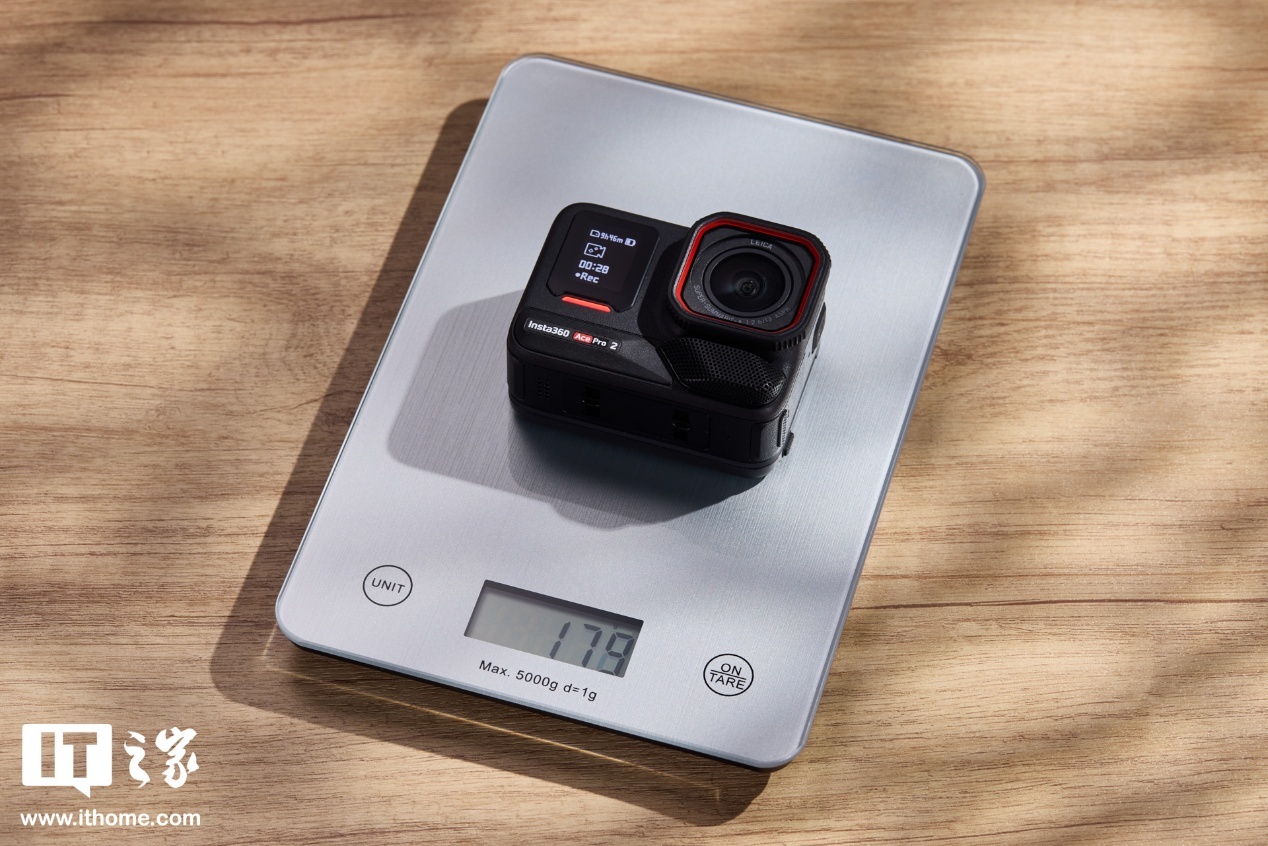 Insta360 Ace Pro 2 的尺寸为 71.9×52.2x38mm,正面投影面积与银行卡相仿;重 177.2g,我们实测安装上麦克风防风罩的重量为 179g。