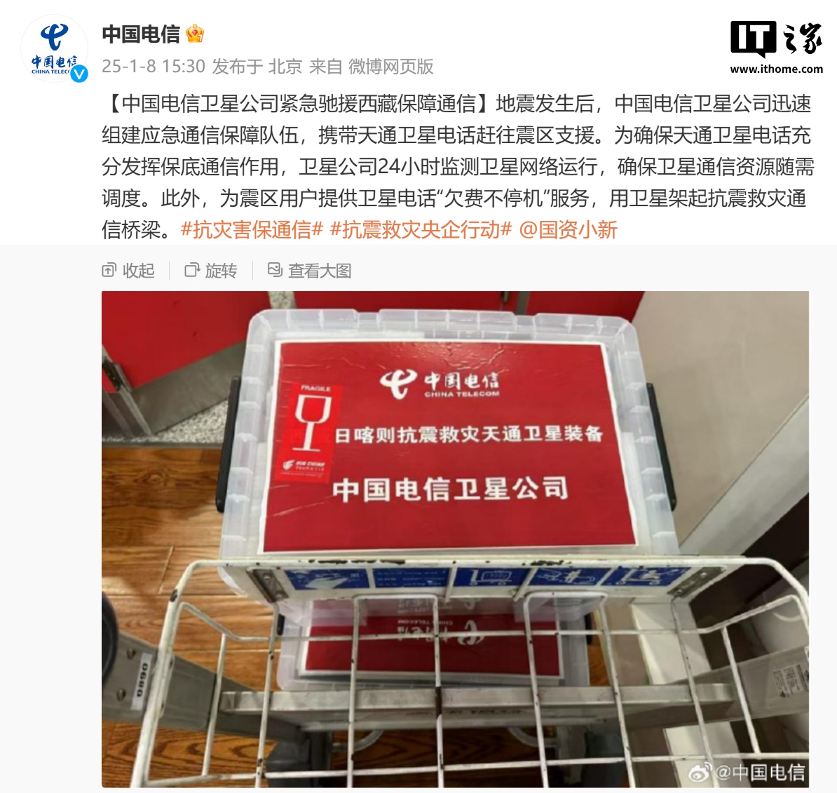 此外,地震发生后,中国电信卫星公司迅速组建应急通信保障队伍,携带天通卫星电话赶往震区支援。为确保天通卫星电话充分发挥保底通信作用,卫星公司 24 小时监测卫星网络运行,确保卫星通信资源随需调度,并为震区用户提供卫星电话“欠费不停机”服务。