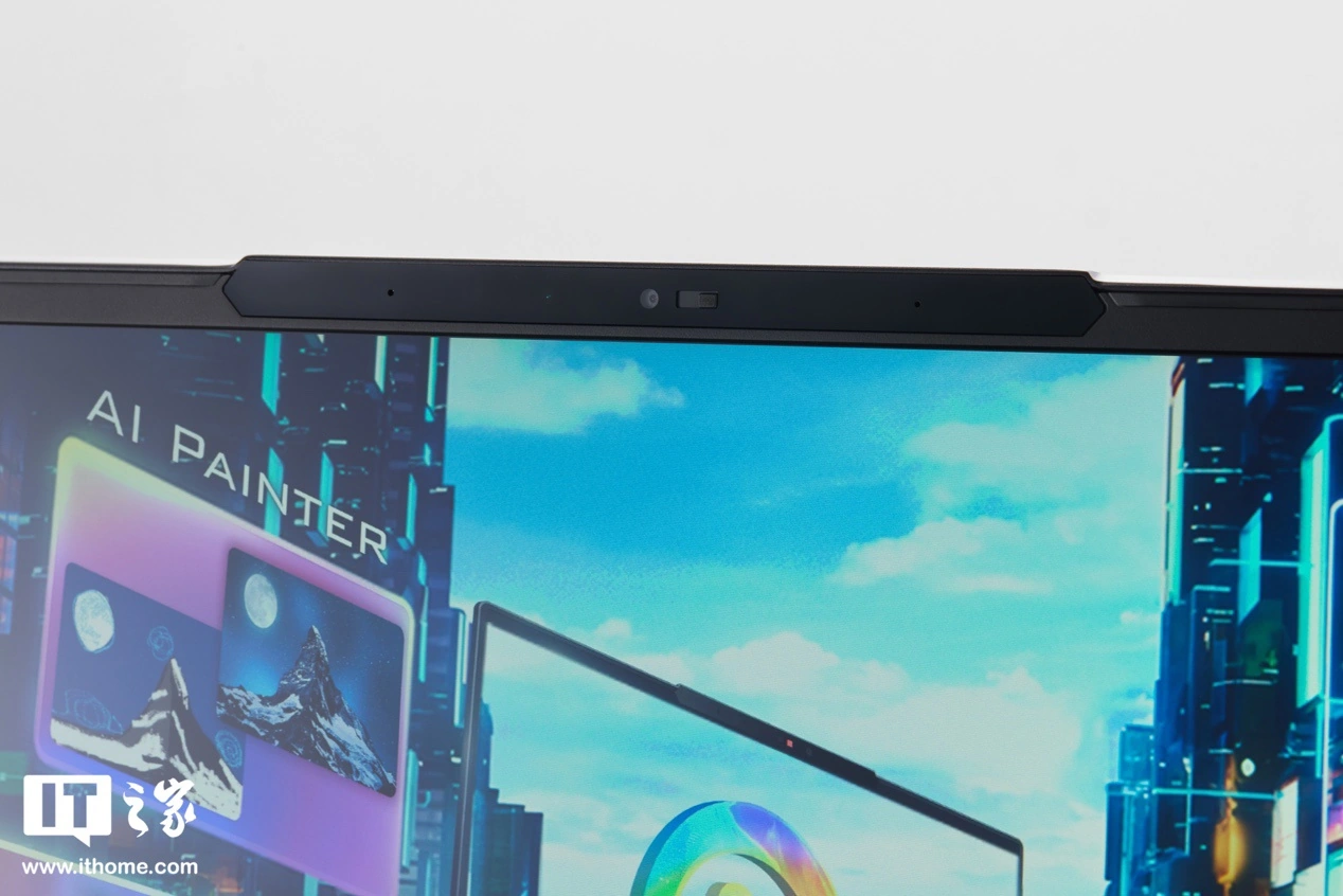 B 面采用了三窄边设计,屏幕顶部做了一条凸起设计,安排了完整的摄像头模组,光线传感器以及拾音 mic,摄像头模组自带物理遮罩和拨片开关,进一步提升了用户隐私。屏幕底部边框要宽一些,居中部分印有银色哑光的 MSI Logo。
