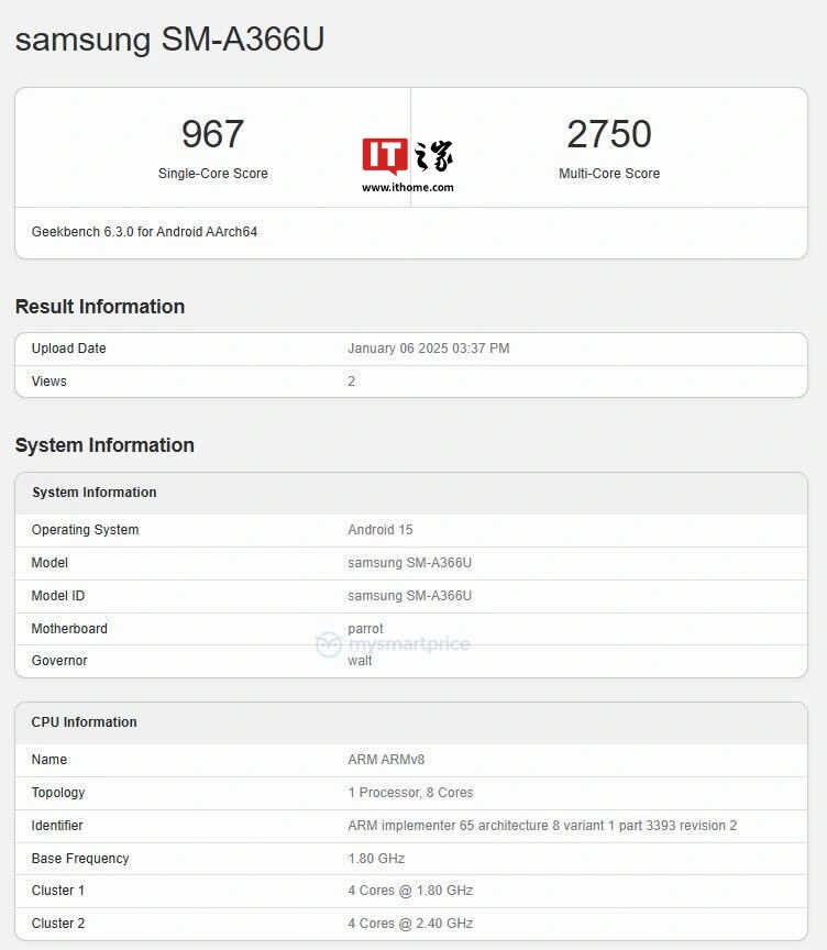 IT之家 1 月 9 日消息,科技媒体 MySmartPrice 于 1 月 7 日发布博文,报道称美版三星 Galaxy A36 5G 手机现身 GeekBench 跑分库,6.3.0 版本单核成绩为 967 分,多核成绩为 2750 分。