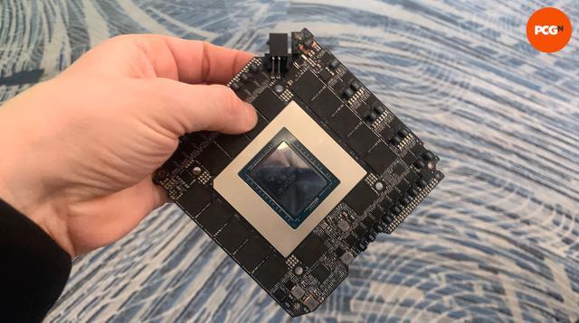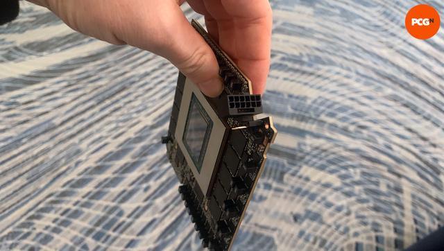 该板的尺寸非常小巧,一只手就可以握住,正面可以看到中间的 GPU 芯片和周围的 32GB 显存。PCB 背面比较简洁,一侧可以看到 16-pin 电源接口。