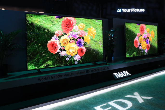 而在展会开幕前,海信先行秀肌肉,举行了显示技术发布会,全球首发RGB三维控色液晶显示技术及全新一代信芯AI画质芯片,并推出全球首台也是最大的116英寸RGB-Mini LED电视,并将于今年3月实现量产上市。