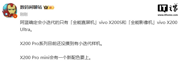 IT之家 1 月 9 日消息,博主 @数码闲聊站 今日爆料称,vivo 确定会小迭代的只有「全能直屏机」vivo X200S 和「全能影像机」vivo X200 Ultra。X200 Pro 系列目前还没摸到有小迭代样机,X200 Pro mini 会有一个新配色要上。