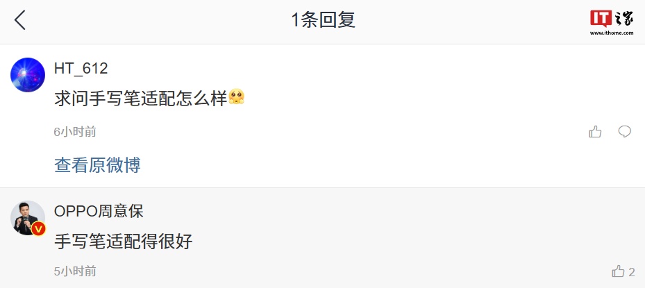 IT之家注意到,有网友在评论区中询问手写笔功能的适配情况,周意保回复称“手写笔适配得很好”。结合前代机型相关功能适配情况来看,Find N5 折叠屏新机有望继续支持手写笔功能。