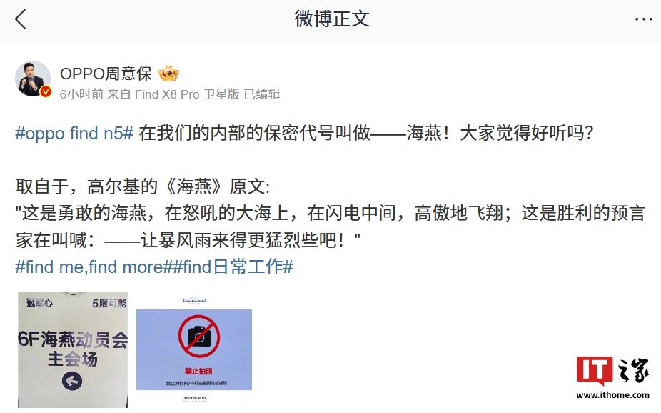 IT之家 1 月 9 日消息,OPPO Find 系列产品负责人周意保今日发文透露,Find N5 折叠屏手机的内部保密代号为“海燕”。