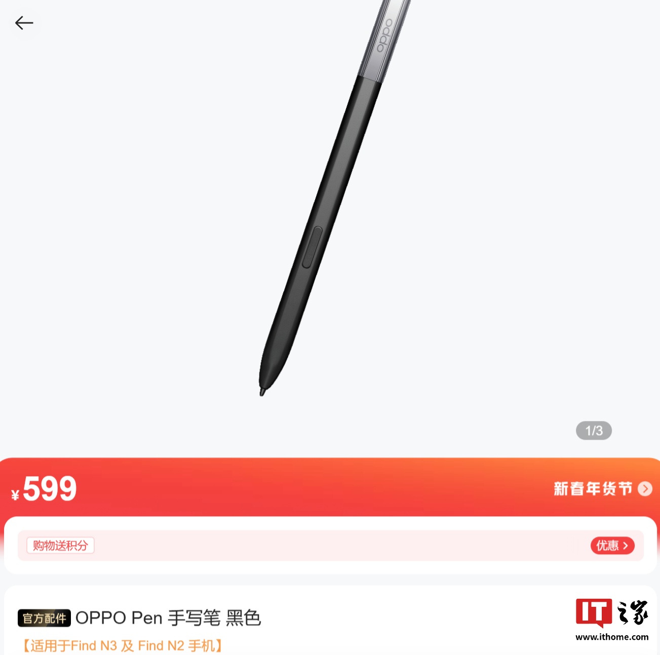 目前 OPPO 官网在售有黑色款 OPPO Pen 手写笔,定价 599 元,适配 FInd N3 和 Find N2 折叠屏手机。