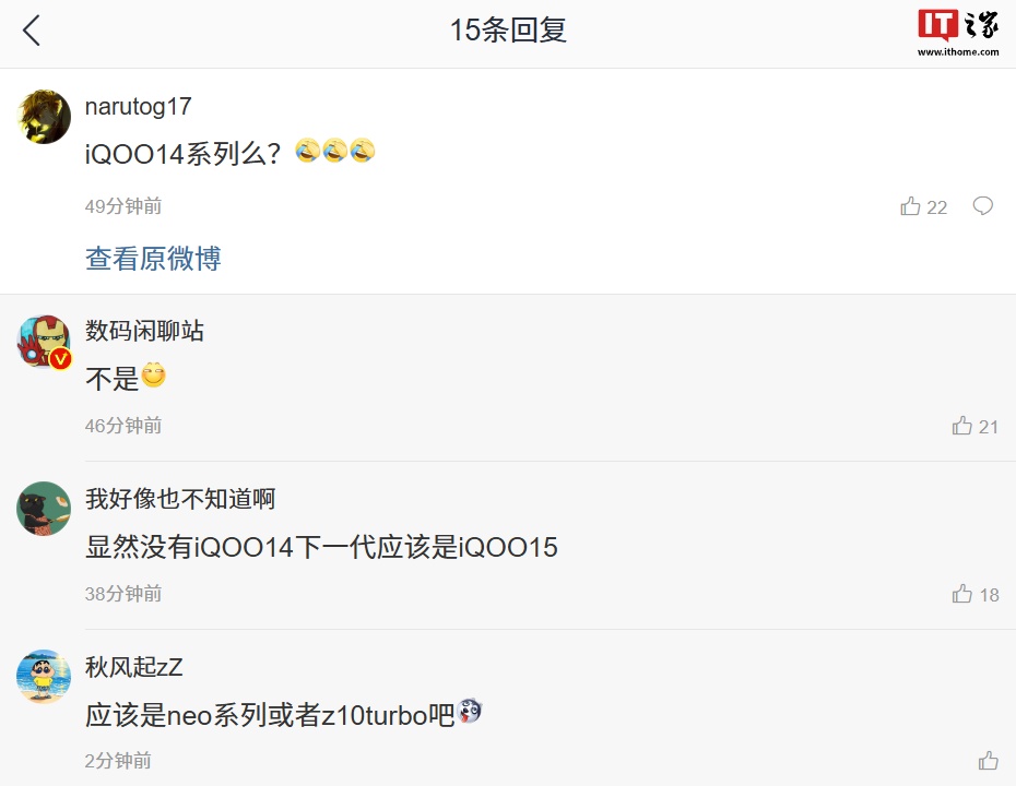 目前博主暂未透露新机更多信息,评论区中有网友询问测试机型是否为 iQOO 14 手机,博主回复称“不是”,并配上了“滑稽”表情。