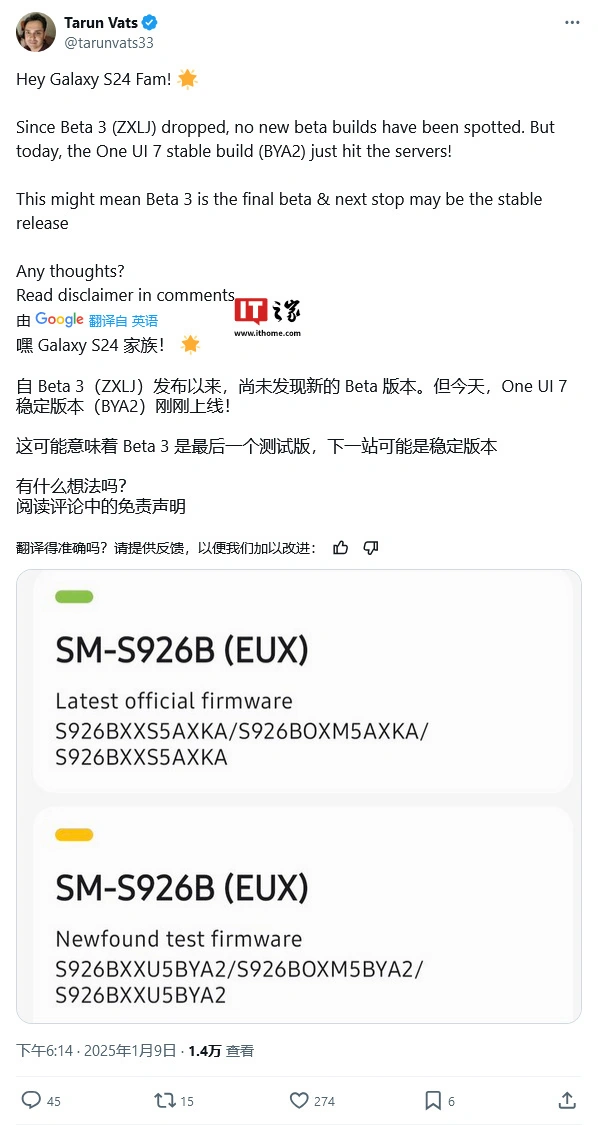 文章来源于互联网:IT之家-告别 Beta:三星 Galaxy S24 系列手机有望本月底推送 One UI 7 稳定版