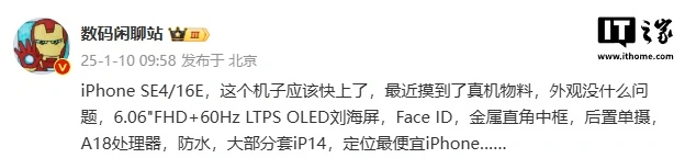 IT之家 1 月 10 日消息,博主 @数码闲聊站 今日爆料称苹果 iPhone SE 4/16E 应该快上了,定位最便宜 iPhone。并曝光了新机部分参数。