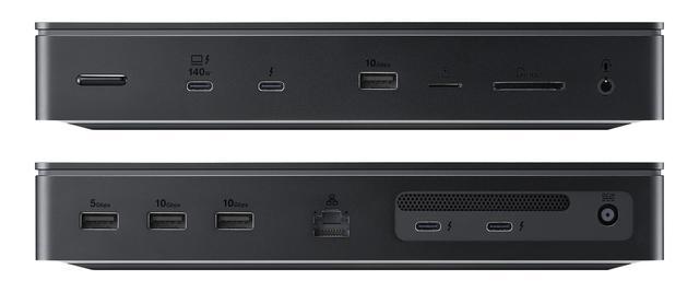 该扩展坞正面配备 1 个支持 140W PD-out、DP Alt 输出的全功能雷电 5 上行接口、1 个雷电 5 下行接口、1 个 USB-A 10Gbps 接口、1 个 UHS-II 速率 microSD 读卡器、1 个 UHS-II 速率 SD 4.0 读卡器、1 个二合一 3.5mm 音频插孔。