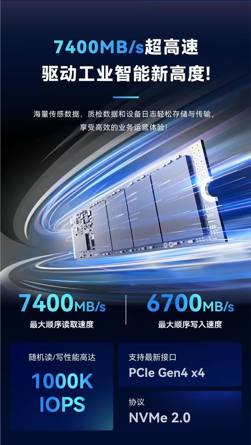 IT之家援引新闻稿,这款工规 PCIe 4.0 SSD 最大顺序读取速度为 7400 MB/s,最大顺写入取速度为 6700 MB/s,支持 PCIe Gen4 x4 接口和 NVMe 2.0 协议,精选工业级颗粒和器件,能在-20 摄氏度到 70 摄氏度温域平稳运行。