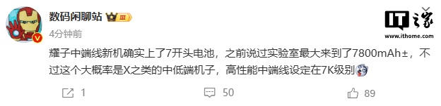 IT之家 1 月 11 日消息,博主 @数码闲聊站 今日爆料称,荣耀中端线新机确实上了 7 开头电池,之前说过实验室最大来到了 7800mAh±,不过这个大概率是 X 之类的中低端机子,高性能中端线设定在 7K 级别。