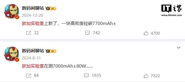 该博主去年 12 月 20 日曾爆料称,欧加(包括 OPPO、一加、realme 真我)实验室已经研发出了一块高密度硅碳电池,其容量高达约 7700mAh±,未来有望搭载于该集团旗下的新款机型中。按照目前的开发进度,预计明年有多款新机有望用上超 7000mAh 电池。