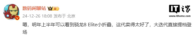 IT之家注意到,目前关于以上新机的配置信息还较少,该博主此前曾爆料称今年上半年可以看到骁龙 8 Elite(骁龙 8 至尊版)小折叠,大迭代直接提档登场,评论区网友推测为小米 MIX Flip 2。