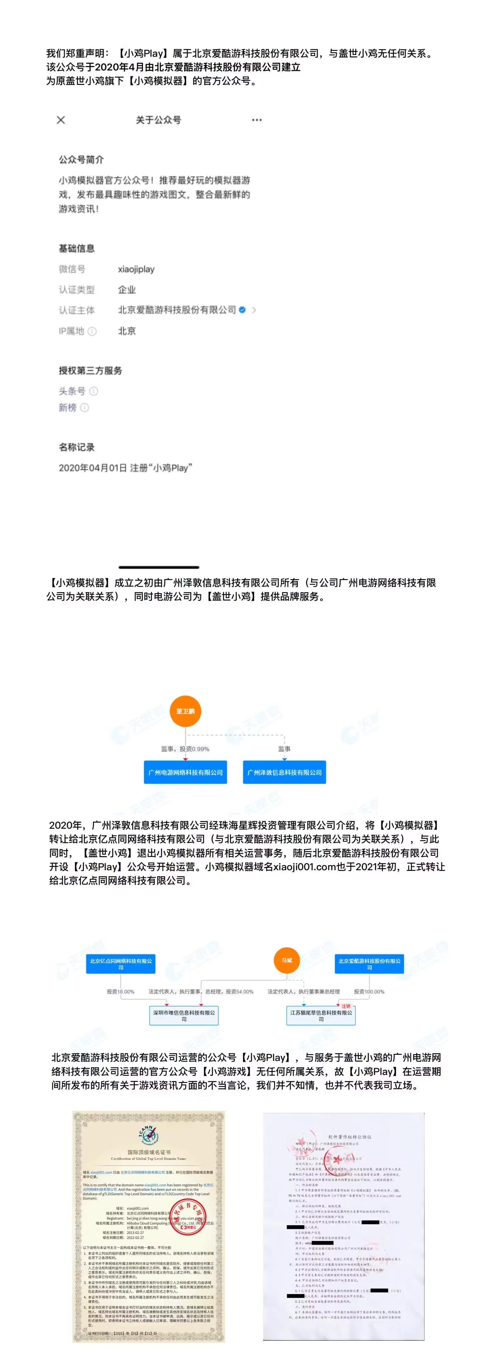 “盖世小鸡”从未参与《小鸡 Play》的运营,《小鸡 Play》和《小鸡模拟器》在 2020 年后,其在运营期间所发布的所有关于米哈游游戏方面的不当言论,“盖世小鸡”均不知情,更不代表“盖世小鸡”公司立场。