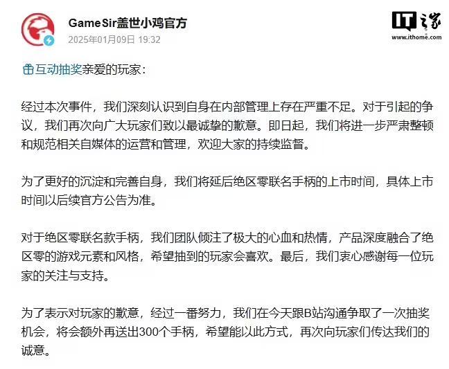 在此之前,GameSir 盖世小鸡针对过去的一些言辞向米哈游《绝区零》玩家发布致歉说明。IT之家附官方原文内容如下: