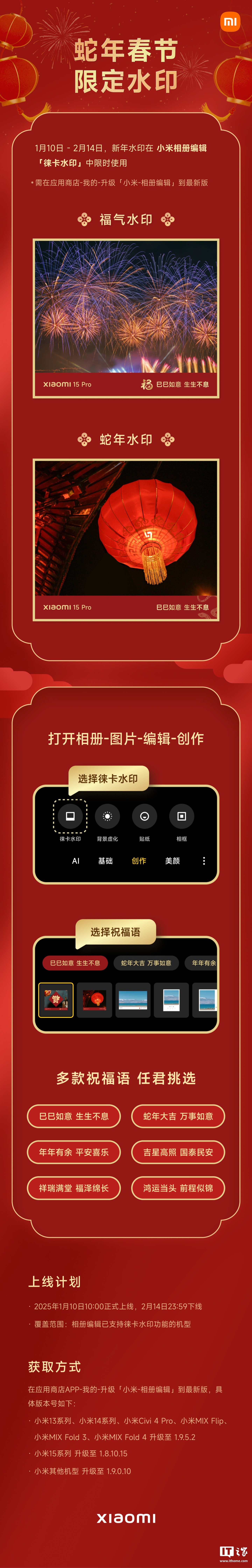 此外,小米已在本周(1 月 10 日)宣布推出“蛇年春节水印”,1 月 10 日-2 月 14 日限时上线,提供祝福语挑选使用,覆盖范围包括相册编辑已支持徕卡水印功能的机型。