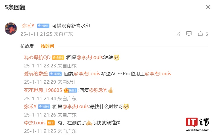 IT之家 1 月 12 日消息,一加中国区总裁李杰昨日针对是否会推出“新春水印”功能的相关问题作出回复,并称“有,在测试了,很快就能推送”。