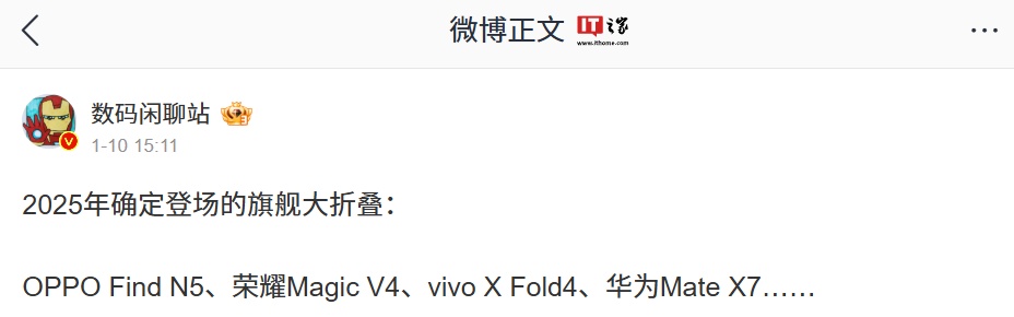 IT之家 1 月 12 日消息,博主 @数码闲聊站本周(1 月 10 日)发文透露,2025 年确定登场的旗舰大折叠手机包括 OPPO Find N5、荣耀 Magic V4、vivo X Fold 4、华为 Mate X7 等。