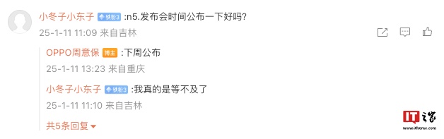 据IT之家昨日报道,OPPO Find 系列产品负责人周意保在微博评论区回复网友提出的多个 Find N5 折叠屏手机相关问题。他透露,Find N5 的发布会时间“下周公布”,此次发布的产品也将足够惊艳。