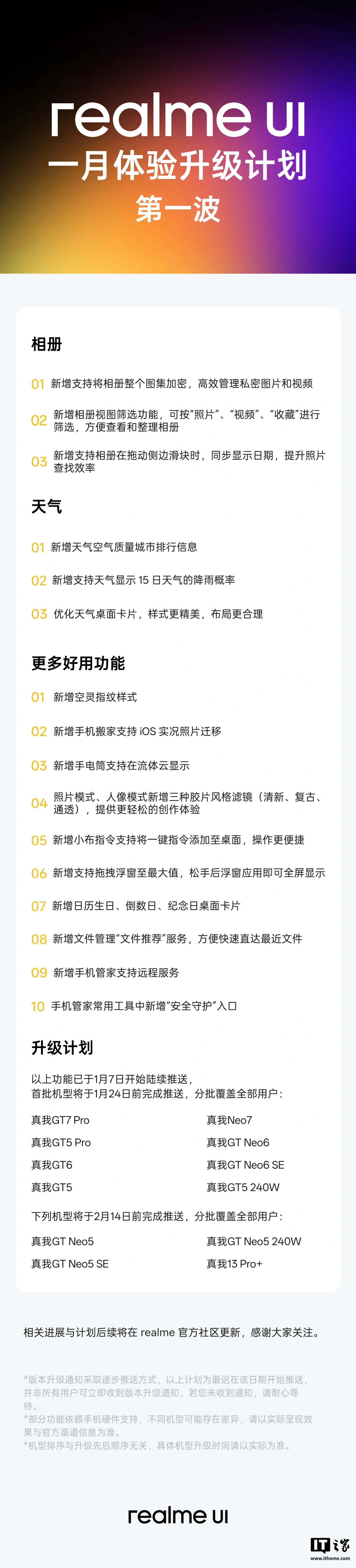 IT之家 1 月 12 日消息,真我官方本周(1 月 10 日)发布了 realme UI 更新预告,官方计划 1 月 13 日-1 月 19 日为真我 GT7 Pro、GT Neo5 等十款机型提供更新。
