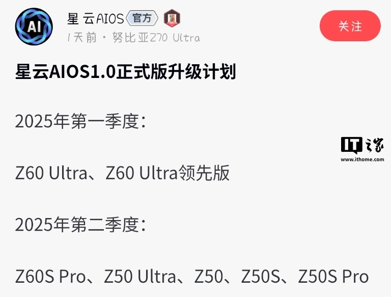 文章来源于互联网:IT之家-努比亚星云 AIOS1.0 正式版升级计划公布,Z60 Ultra 等机型一季度适配