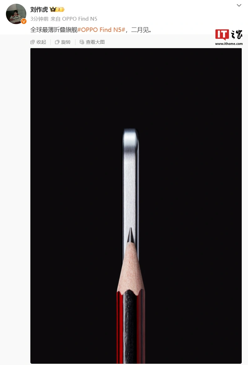 IT之家 1 月 13 日消息,OPPO 首席产品官、一加创始人刘作虎今日发文宣布,OPPO Find N5 折叠屏手机二月见,并称其为“全球最薄折叠旗舰”。
