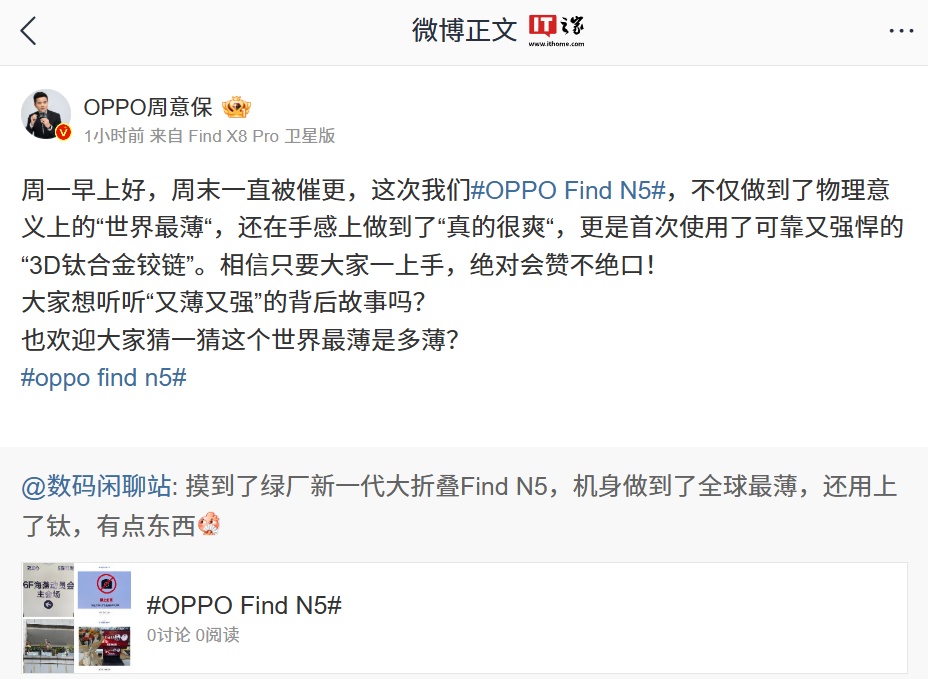 IT之家注意到,OPPO Find 系列产品负责人周意保今日发文称,“Find N5 折叠屏手机不仅做到了物理意义上的‘世界最薄’,还在手感上做到了‘真的很爽’,更是首次使用了可靠又强悍的‘3D 钛合金铰链’。”