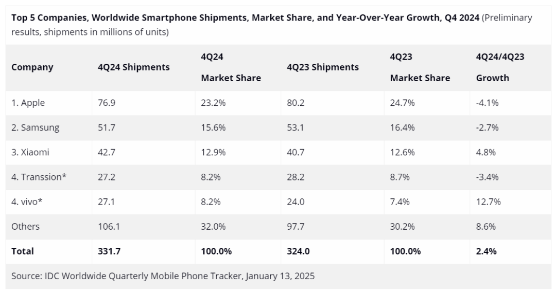 IT之家 1 月 14 日消息,国际数据公司(IDC)今日发布的最新《全球季度手机跟踪报告》初步数据显示,2024 年第四季度(4Q24)全球智能手机出货量同比增长 2.4%,达到 3.317 亿部,连续第六个季度保持增长。