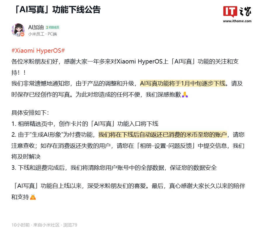 IT之家 1 月 14 日消息,小米员工 @AI加油 昨日在小米社区发布「AI 写真」功能下线公告,称该功能将于 1 月中旬逐步下线,用户已消费的米币将自动返还。