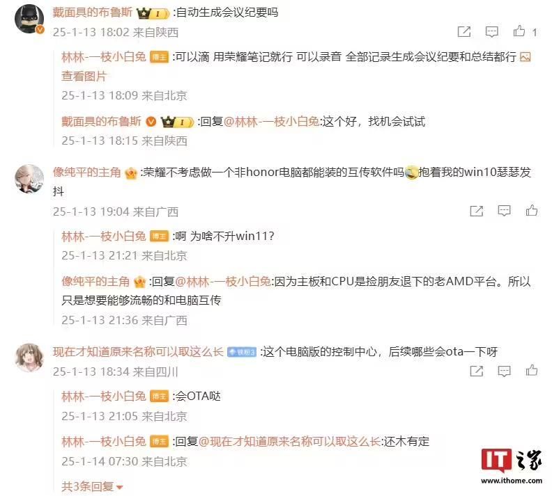 林林在评论区中回复了部分用户的问题:针对 YOYO 会议是否可以自动生成会议纪要,他回复“可以滴,用荣耀笔记就行,可以录音,全部记录生成会议纪要和总结都行”;针对控制中心适配情况,他表示“会 OTA 哒”,但具体机型没定;针对 X14 笔记本是否支持新功能,他称“还在讨论,不能承诺,尽量”。