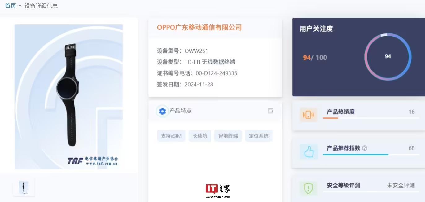 据IT之家此前报道,OPPO 旗下型号为“OWW251”的 TD-LTE 无线数据终端已通过国内 3C 认证,并现身电信设备终端网。相关页面图片显示其为一款圆形智能手表,支持 eSIM、搭载安卓系统、内置 631mAh 电池。