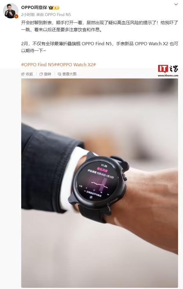 IT之家 1 月 14 日消息,OPPO Find 系列产品负责人周意保今日发文透露,OPPO Watch X2 智能手表将支持高血压风险提示,会和 Find N5 折叠屏手机一起在 2 月发布。
