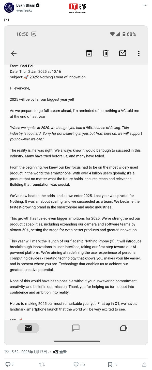 IT之家 1 月 14 日消息,消息源 Evan Blass 昨日(1 月 13 日)在 X 平台发布推文,分享了裴宇发送给 Nothing 员工的内部电子邮件,标题为《2025: Nothing’s Year of Innovation》,确认 Nothing Phone(3)手机今年发布。