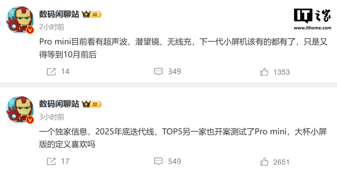 根据微博博主的爆料信息,继 vivo 之后,TOP5 中的另一家也开案测试了“Pro mini”机型。