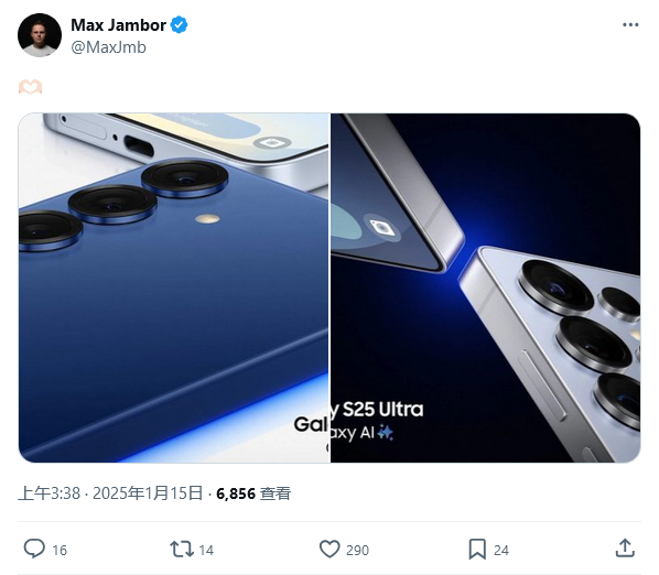 IT之家 1 月 15 日消息,在 1 月 22 日三星正式发布之前,消息源 Max Jambor 再次分享了 Galaxy S25 系列手机的官方宣传图片,可以看到海军蓝的 Galaxy S25、冰蓝色的 S25 + 和钛白色的 S25 Ultra。