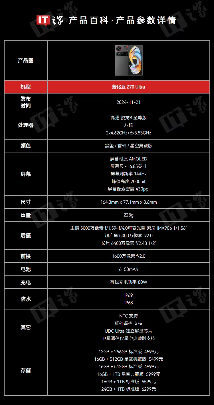 努比亚 Z70 Ultra 手机发布于今年 11 月,该机延续屏下前摄“真全面屏”设计、搭载骁龙 8 至尊版处理器,支持 IP68&IP69 防尘防水,定价 4599 元起。
