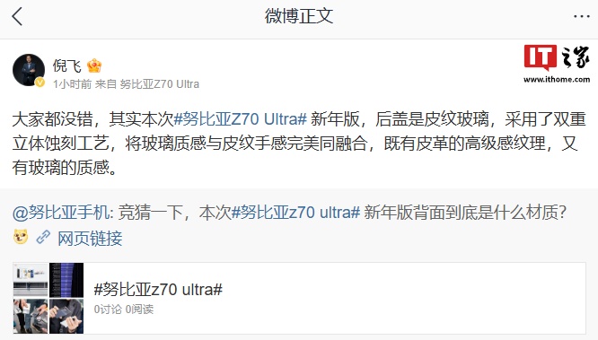 文章来源于互联网:IT之家-努比亚总裁倪飞:Z70 Ultra 手机新年版后盖为皮纹玻璃,采用双重立体蚀刻工艺