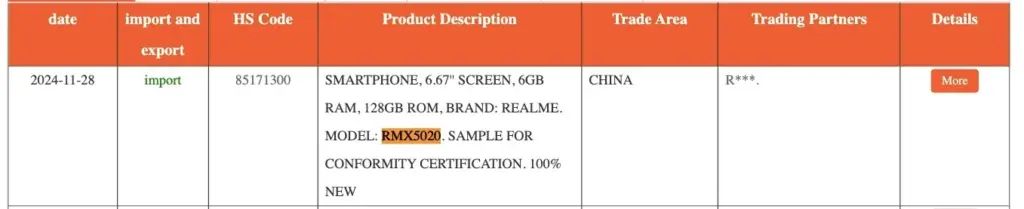 根据 NBD 清单,RMX5020 将配备一块 6.67 英寸大屏幕,手机尺寸为 165.69 x 76.22 x 7.99 mm。此外,该机预计将提供 128GB 存储空间和 6GB 运行内存,足以满足日常应用和轻度多任务处理或游戏的需求。