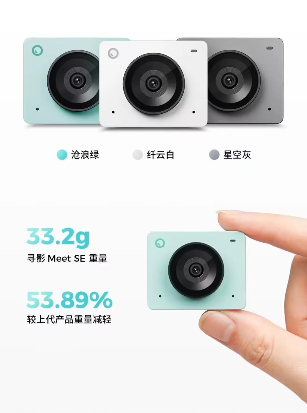 寻影 Meet SE 搭载 1/2.8 英寸 CMOS,支持 HDR;配备降噪麦克风;标配磁吸镜头盖,可避免镜头沾灰同时保护隐私。