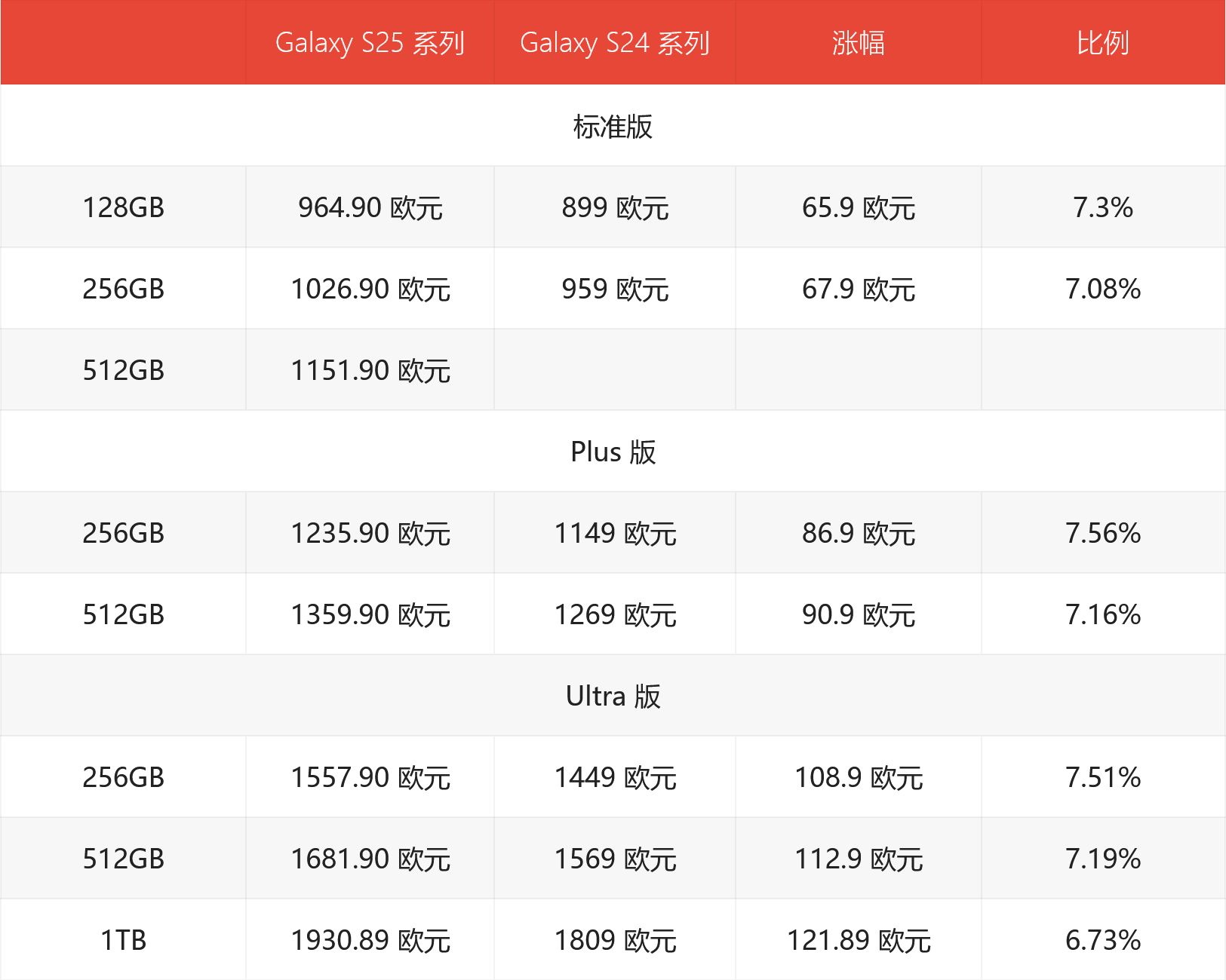 IT之家曾于 1 月 10 日报道,三星 Galaxy S25 手机标准版从 12GB + 128GB 开始,起售价为 964.9 欧元(IT之家备注:当前约 7276 元人民币),平均涨幅在 7% 以上。