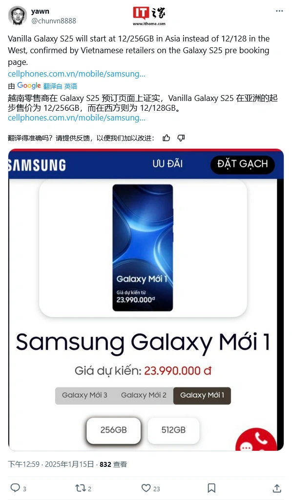 IT之家 1 月 15 日消息,科技媒体 sammyguru 今天(1 月 15 日)发布博文,报道称三星 Galaxy S25 标准版手机在欧洲市场起步存储仍为 128GB,而在越南等亚洲市场起步为 256GB。
