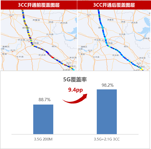 据介绍,安徽电信在京沪高铁全线原有 3.5G 2CC 网络的基础上叠加了 1.8GHz+ 2.1GHz 双频 8T8R 解决方案。1.8GHz+2.1GHz 双频 8T8R RRU 具备 FDD 190MHz 大带宽能力,一次部署实现 5G 和 4G 网络建设。
