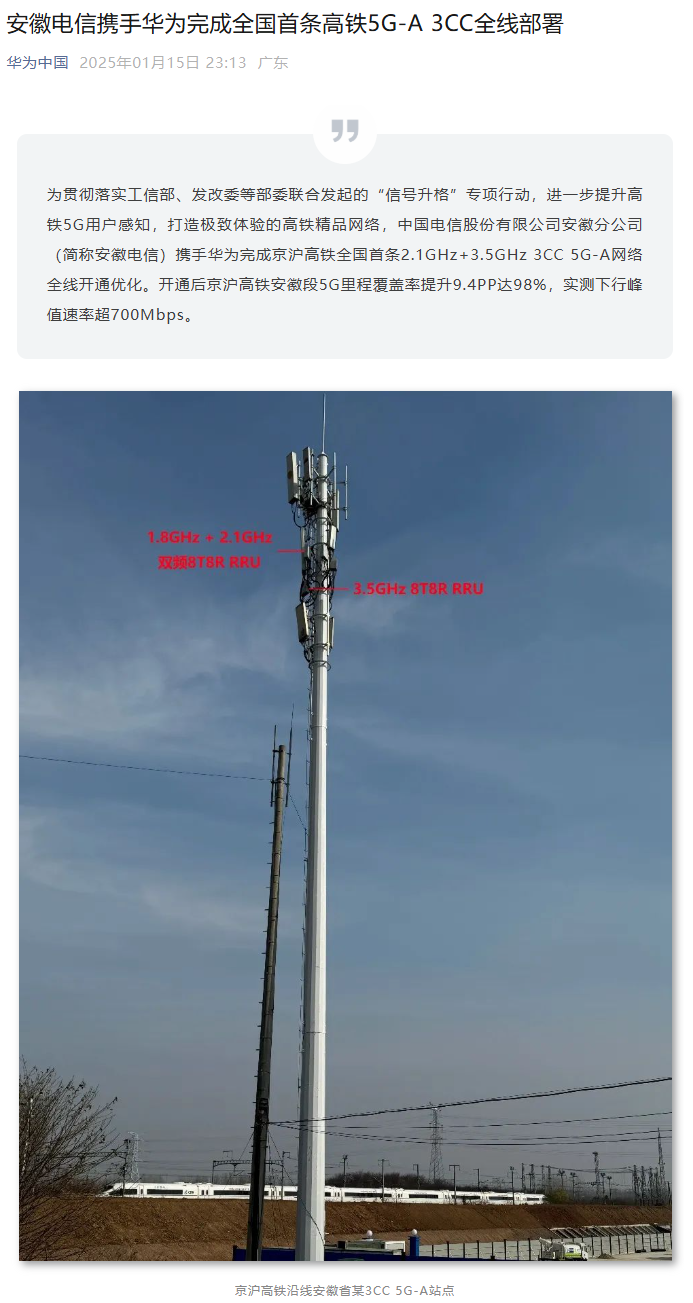 文章来源于互联网:IT之家-华为、安徽电信宣布完成全国首条高铁 5G-A 3CC 全线部署,实测下行峰值速率超 700Mbps