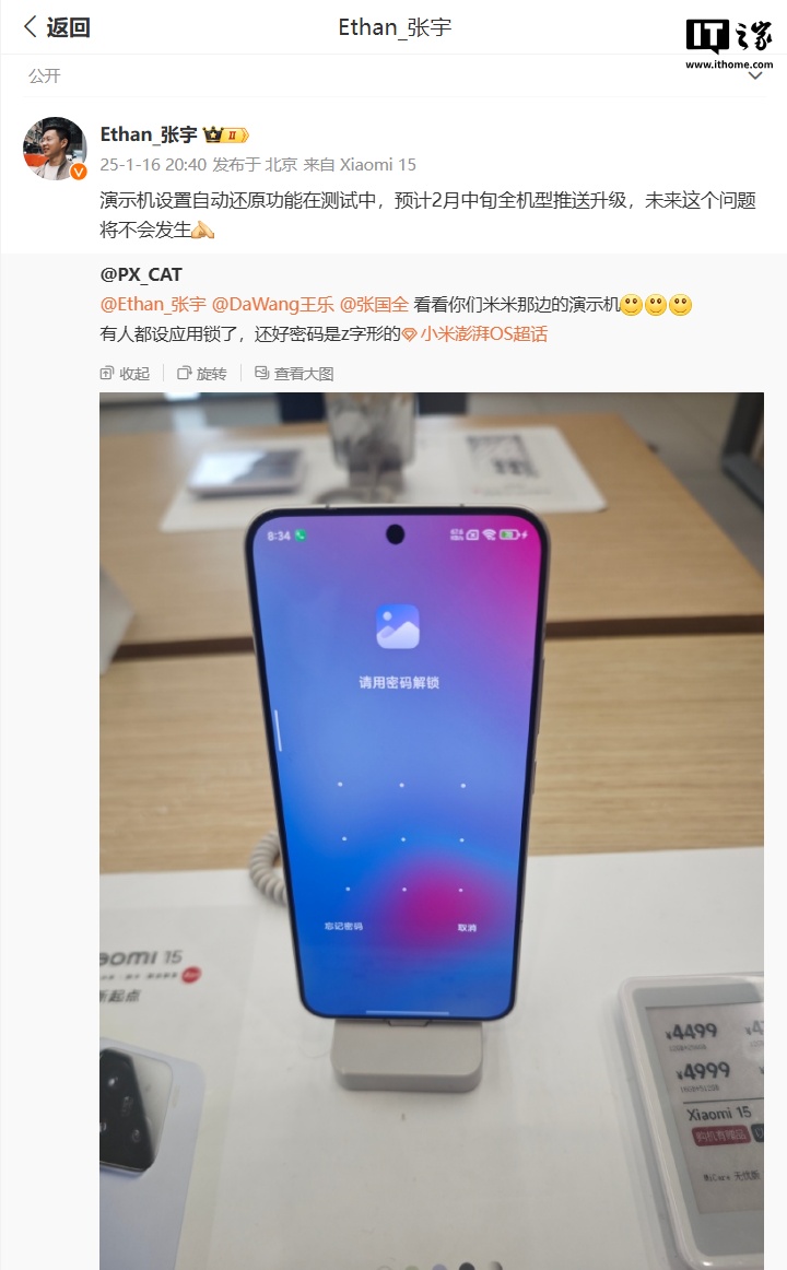 对此,小米产品经理张宇回应称:演示机设置自动还原功能在测试中,预计 2 月中旬全机型推送升级,未来这个问题将不会发生。