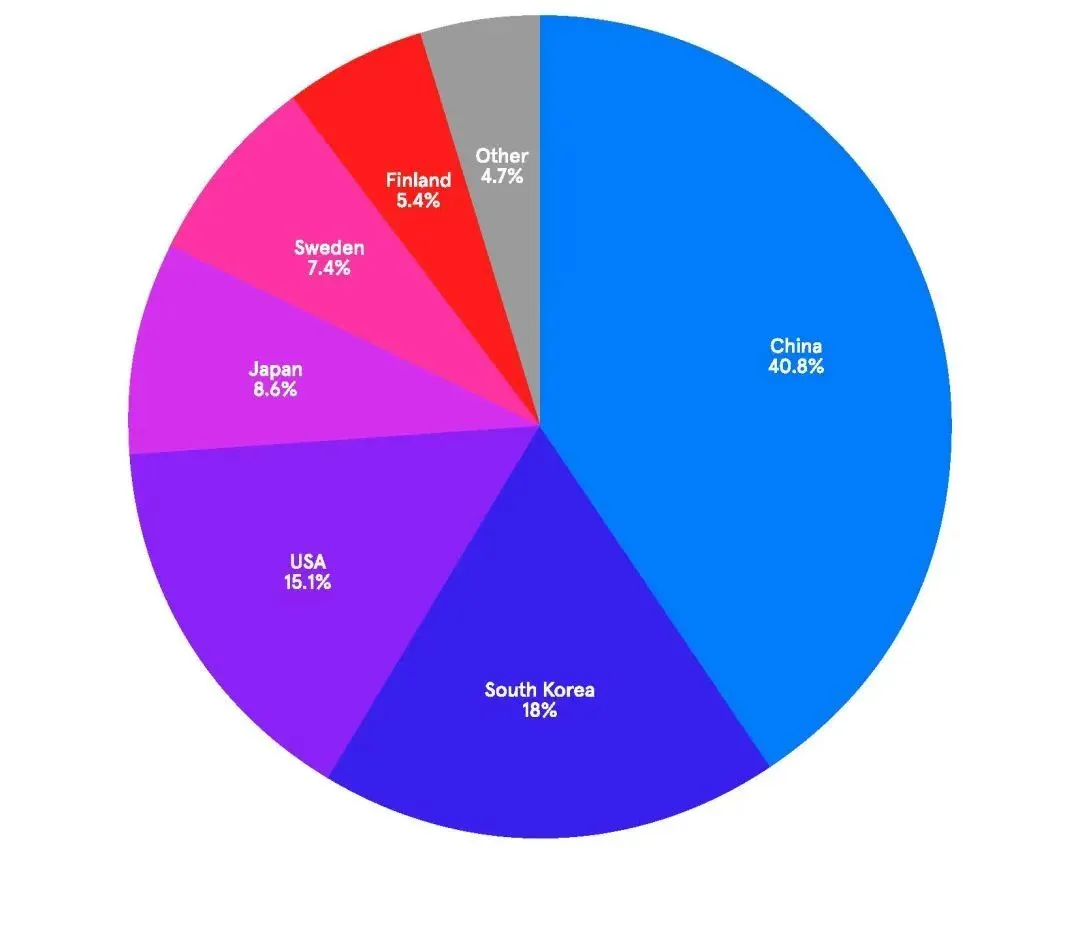 按最终权利人国别统计的 5G 标准必要专利(SEP)家族数量来看,中国排名第一,占比达 40.8%。