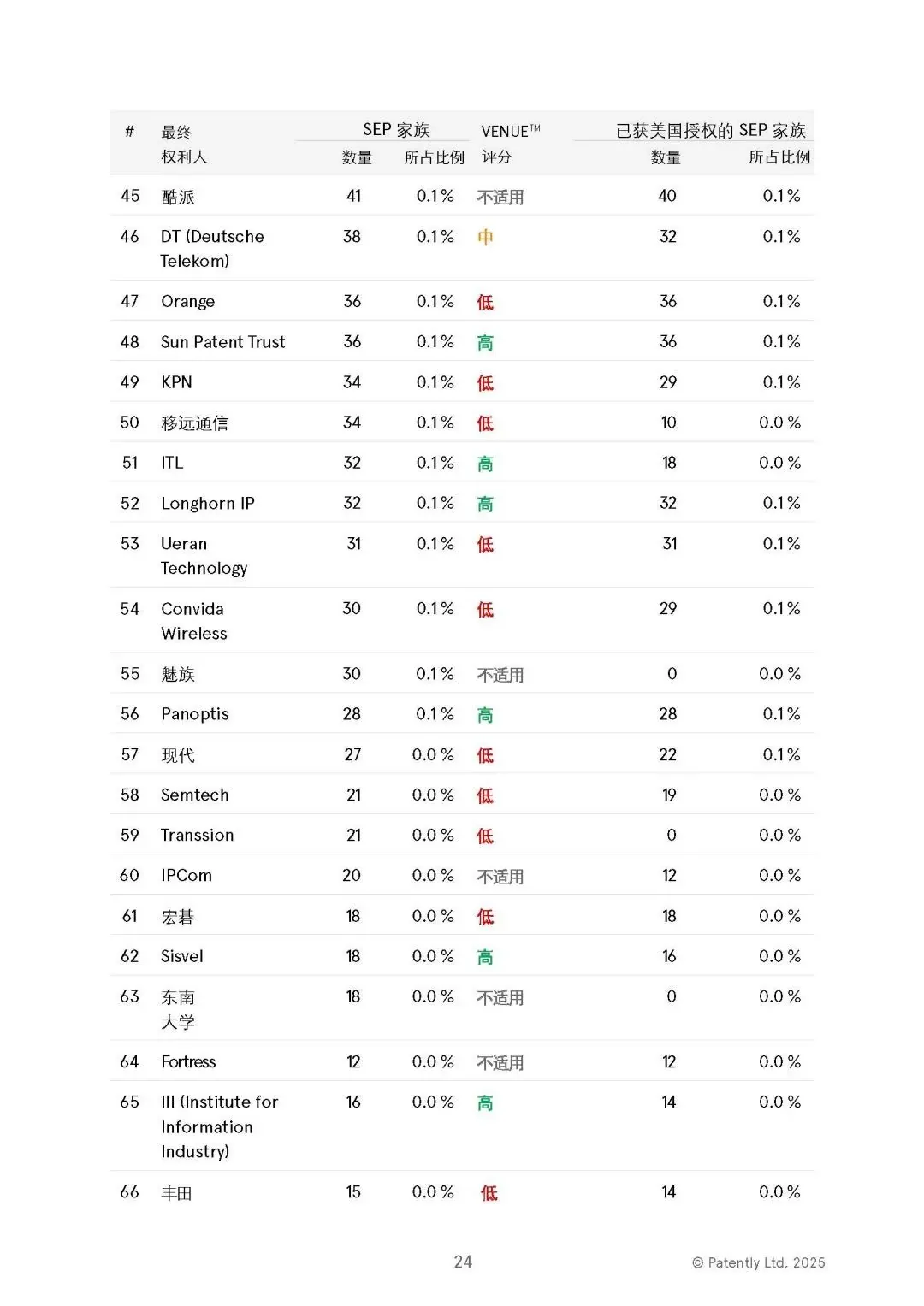 IT之家附 2025 年全球 5G 标准必要专利(SEP)百强权利人榜单如下: