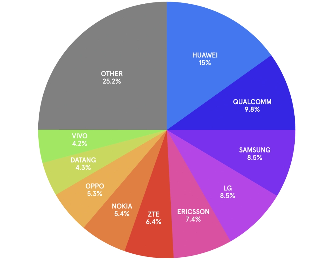 报告中详细列出了位居前十的 SEP 权利人,分别为华为、高通、三星、LG、爱立信、中兴通讯、诺基亚、OPPO、大唐电信和 vivo。华为的份额占比达到了 15%,远远甩开第二名高通(9.8%)。
