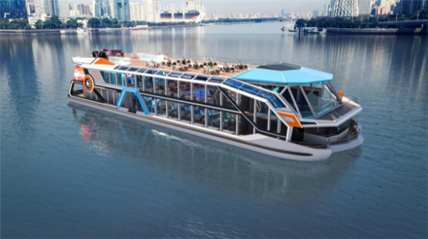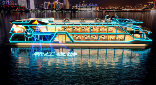 船身设计巧妙融合了丰富的折角与斜面元素,这些几何形态在不同时间段与观察角度下,能够变幻出多姿多彩的光影效果,赋予船体一种未来科技与赛博朋克交织的视觉冲击力,为乘客提供了无比开阔的观光视野。
